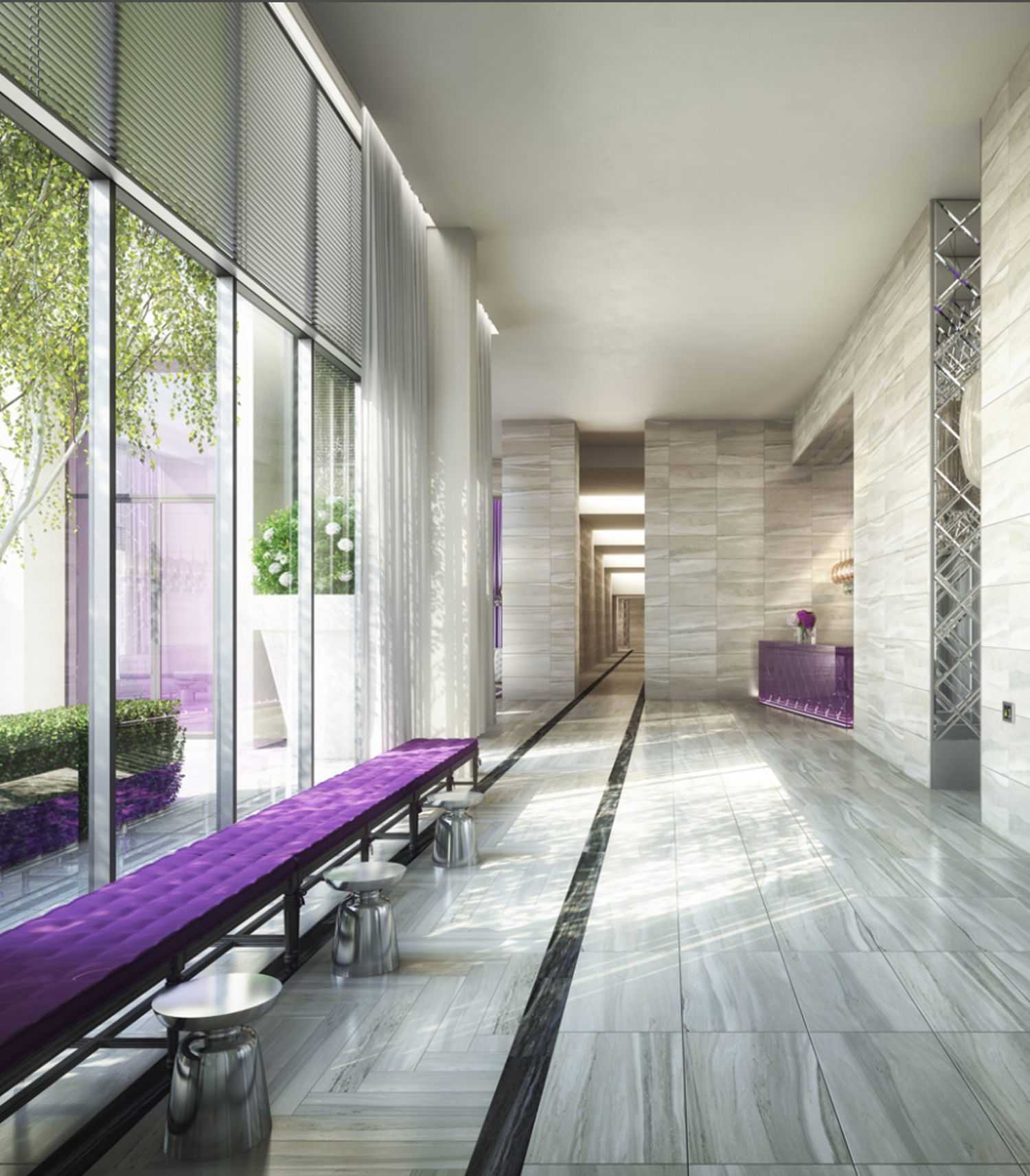 A sophisticated palette of pale grey, silver, and white is enlivened by seductive displays of intense color throughout Metropica’s amenity spaces. From the clubroom and movie theater to the lounge and children’s playroom, YOO has created elegant and inviting settings for every occasion. Outside, the tower’s private saltwater swimming pool is set on a chic terrace with chaise lounges and a dining area.