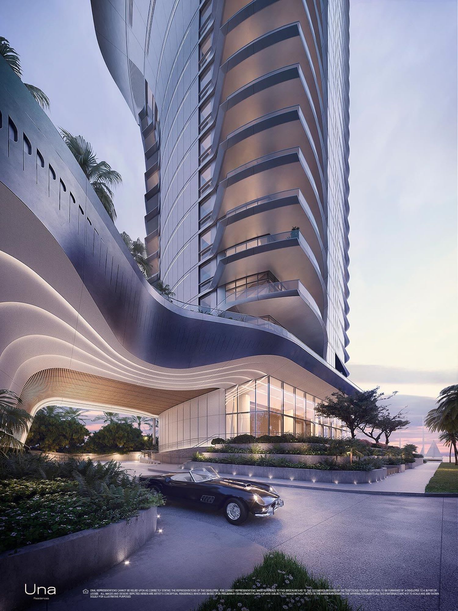 Designed by Adrian Smith + Gordon Gill Architecture, Una takes inspiration from the elegant shapes and materials of classic yacht design. Instantly recognizable by the sweeping curve of the building’s dramatic silhouette, the residences’ glass surfaces brilliantly reflect the dazzling sunlight, and floor-to-ceiling windows take advantage of a coveted setting on Biscayne Bay. Una’s striking architecture is complemented by lush gardens designed by Enzo Enea, an extensive amenities program, and private boat slips. With easy access to Coconut Grove, Downtown, Brickell, Miami International Airport, and the beaches of Key Biscayne, Una is an exemplar for Miami living.